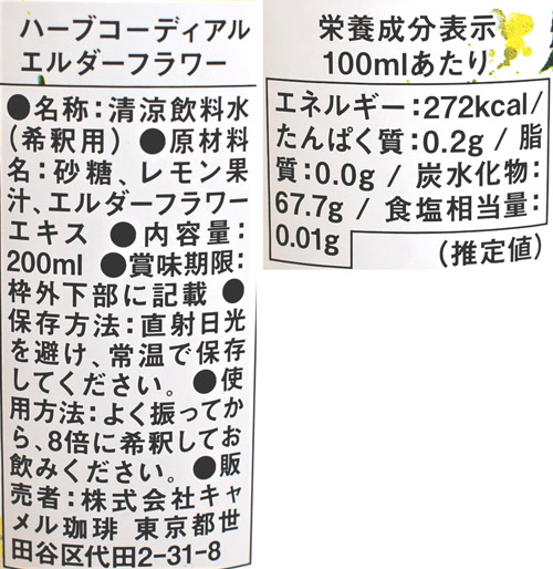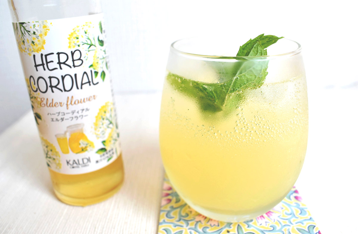 カルディのハーブコーディアルは、エルダーフラワーから抽出したエキスにレモン果汁が配合されているので、やや酸味があるのが特徴。