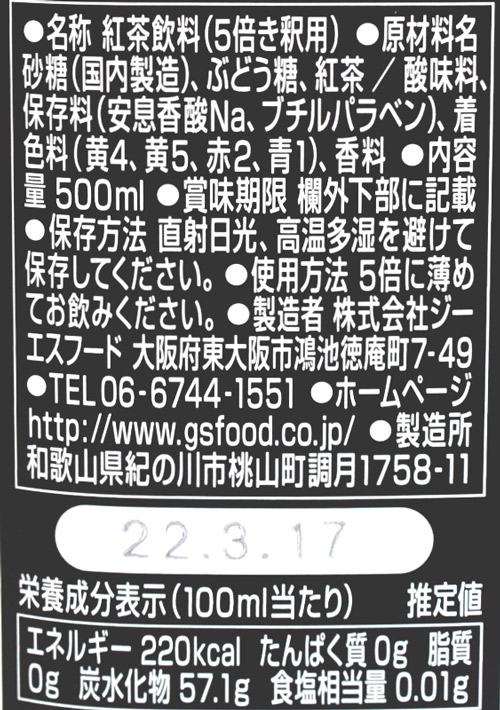 最後にご紹介するのは、スリランカ産セイロン紅茶を使用した、5倍希釈タイプの紅茶ベース「GS ブラックティー 加糖」500㎖540円。水と混ぜるだけで簡単にアイスティーが作れるほか、炭酸水やミルクで割ったりと、さまざまなアレンジを楽しめるのが魅力です。