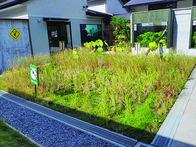 中庭に作られた田んぼでは日本のカエルが暮らしており、暖かい時期にはカエルにさわることもできます。さまざまなカエルたちによる合唱が聞こえることも!