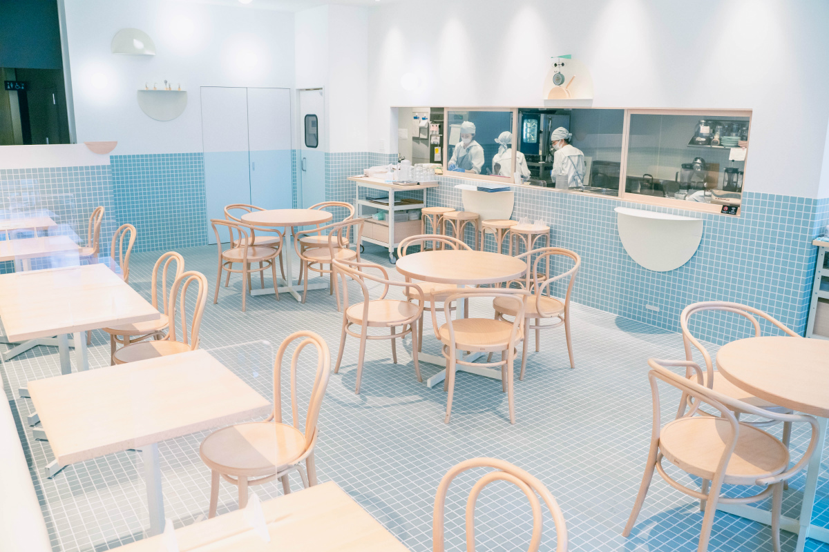 店内の下半分は空色のタイル、上半分は清潔感のある白色、ところどころに浮かぶ飾り棚はまるで雲のようで、なんだか空の中にいるような雰囲気。ホテルの1階だと忘れてしまいそうな異世界感が楽しいです。