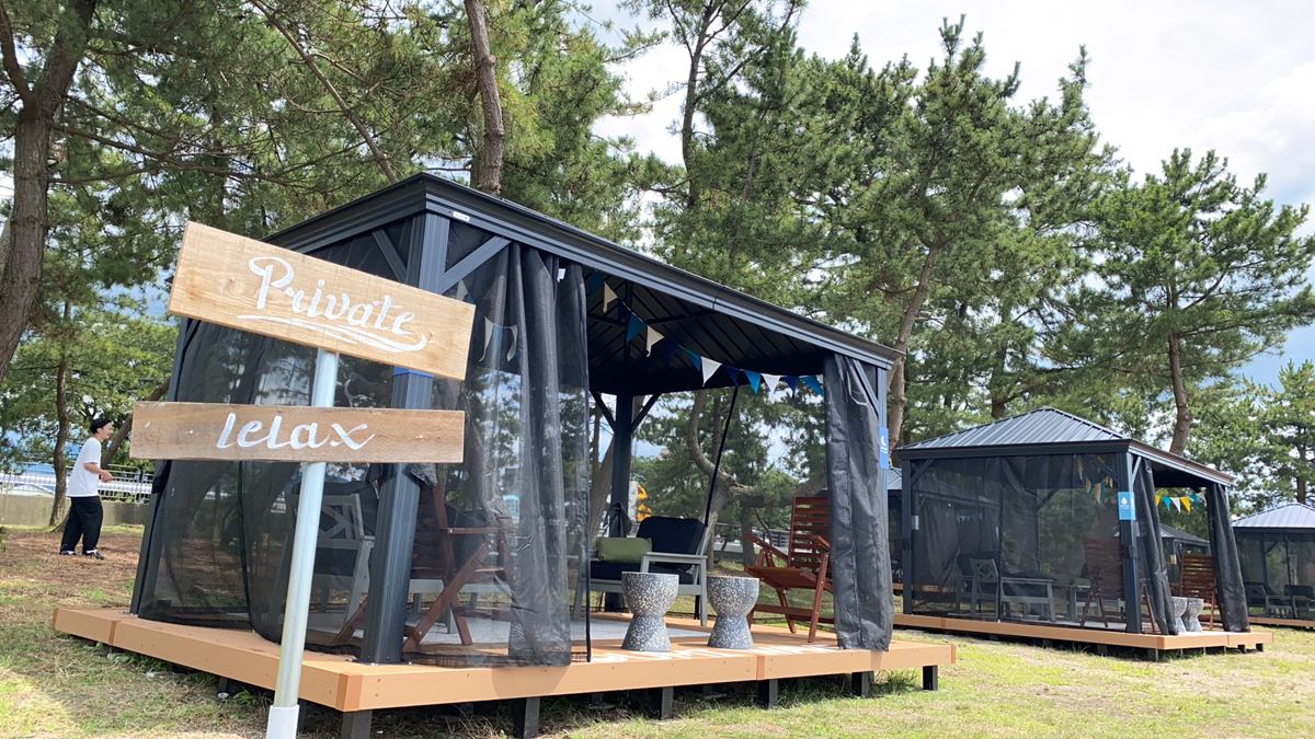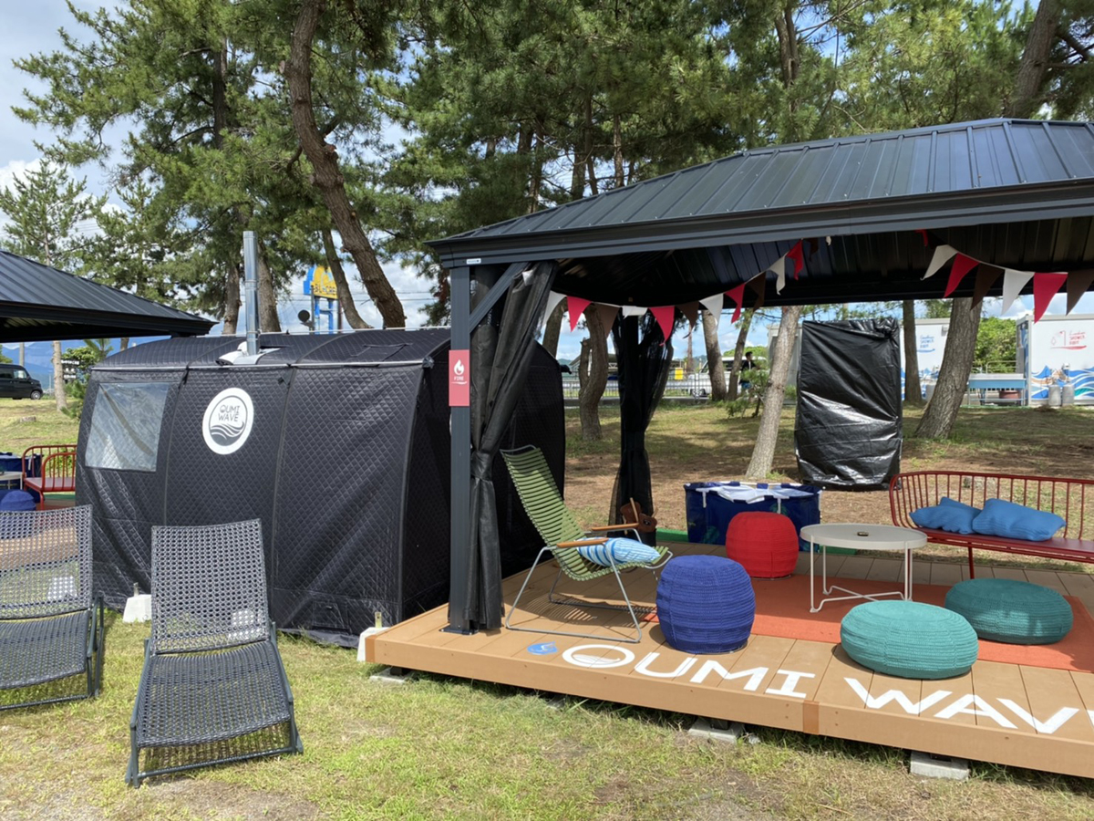 ビーチリゾート「OUMI WAVE」は、JR坂田駅からレンタサイクルで15分、北陸自動車道長浜IC、または米原ICから車で各15分の位置にある、神明キャンプ場に誕生。松林で囲まれた遠浅の神明浜で泳ぐことやSUPなどで遊べるほか、今話題のテントサウナもあり、自然のなかで日々の疲れが癒やせそう!