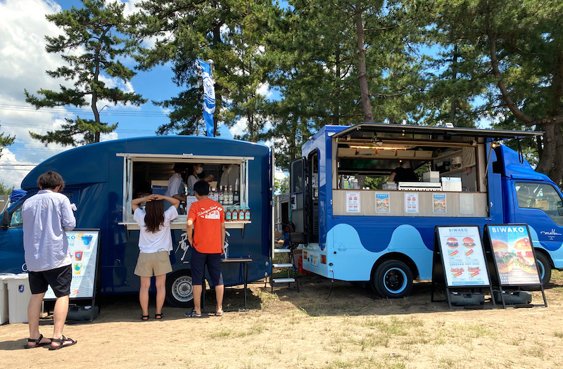 キッチンカーで提供する、ここでしか味わえないグルメもあるので、日没まで1日中楽しめます。夕暮れには、琵琶湖のキレイなサンセットも堪能できますよ。