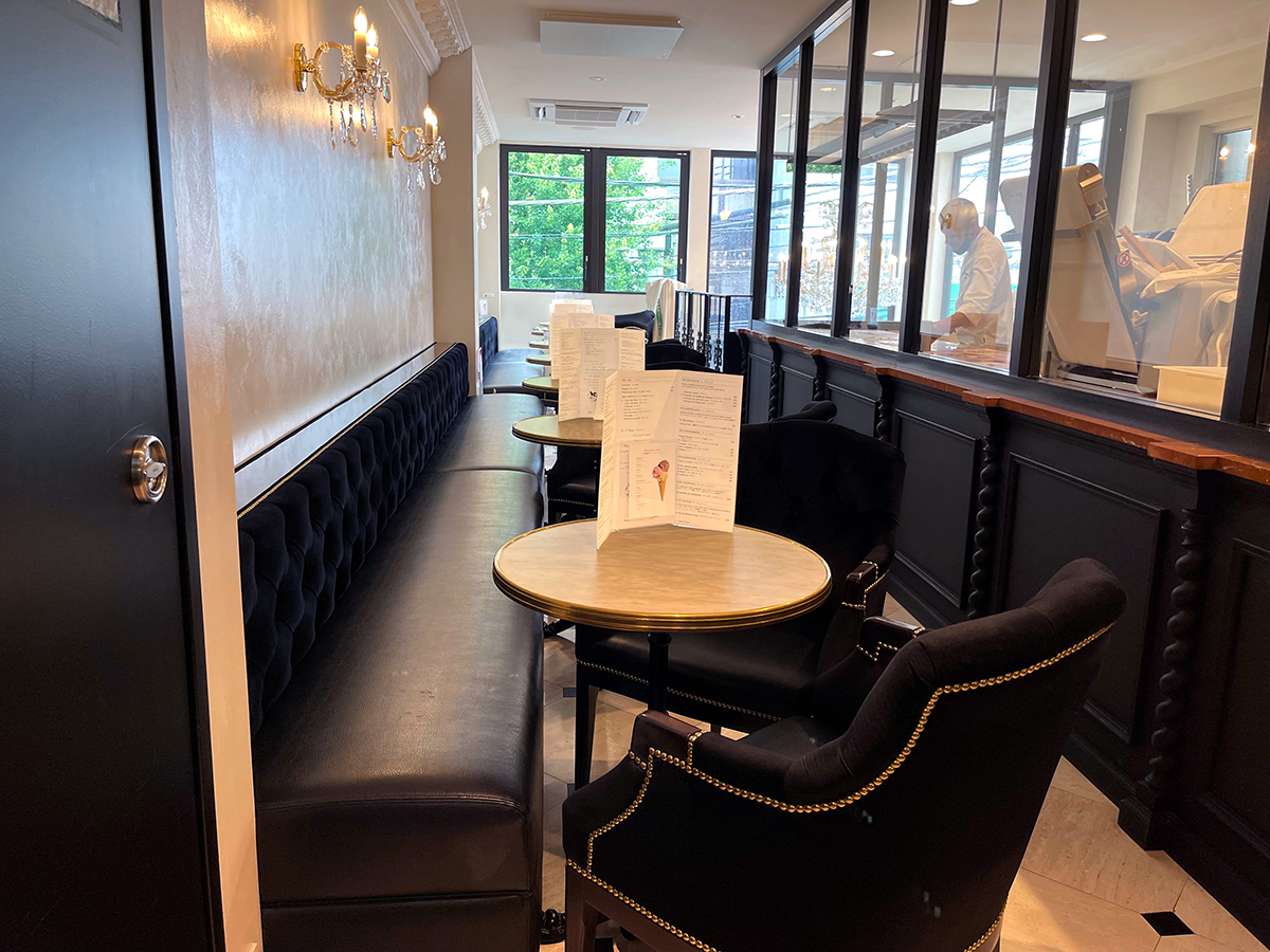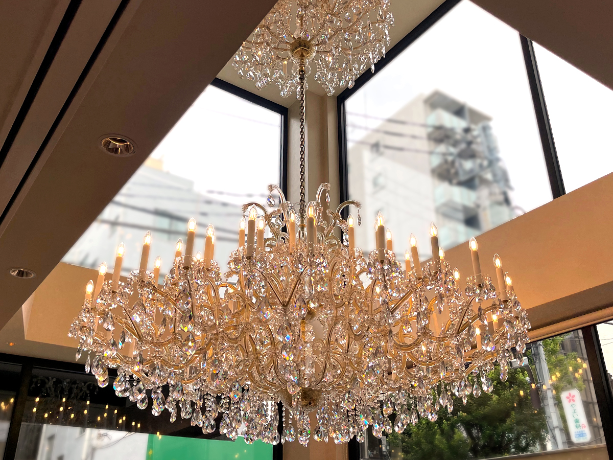 クリスタルのシャンデリアも店内のインテリアも、ほとんどがフランスから直送されてきたものなんだとか。