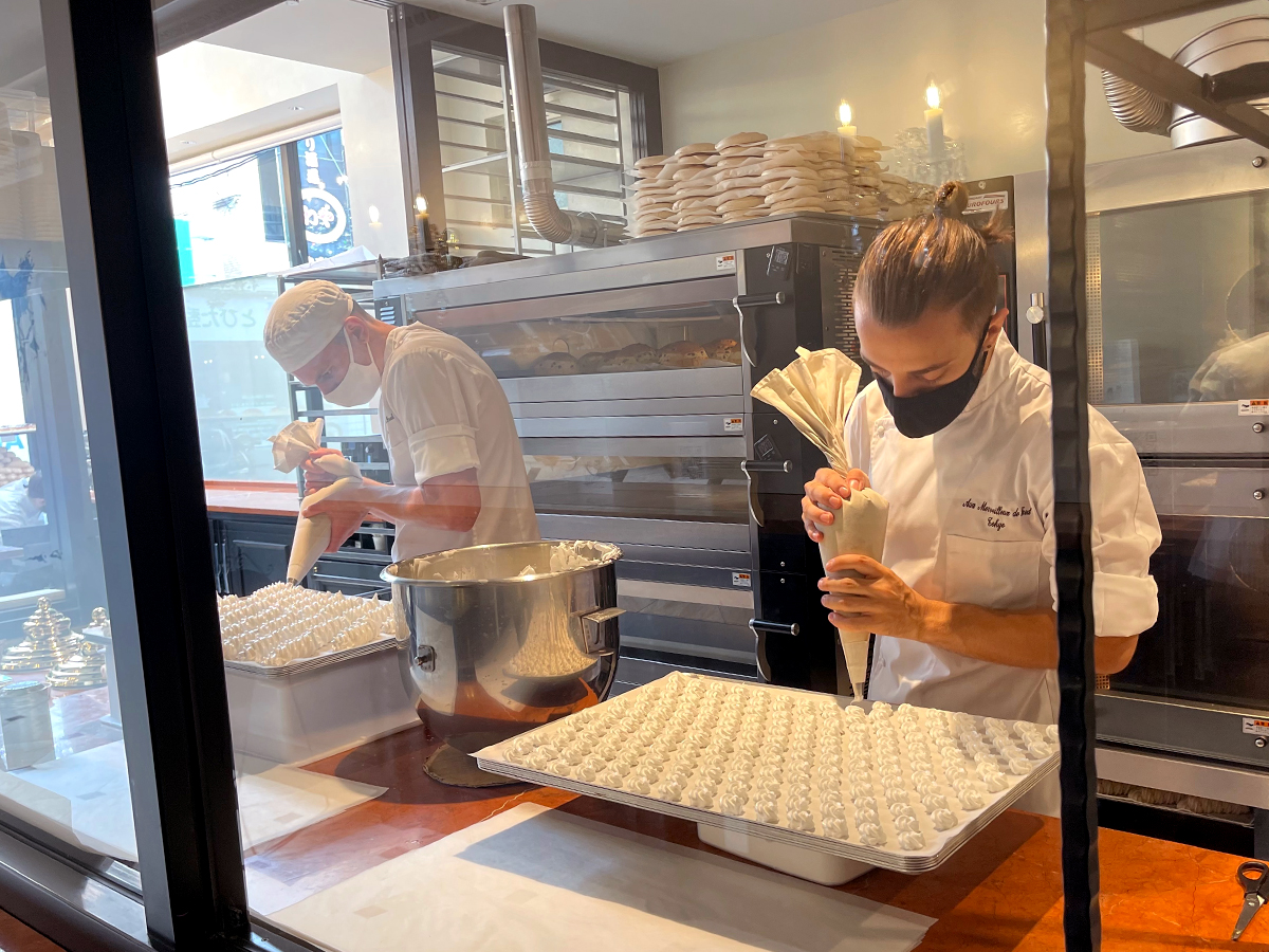 カラフルなメレンゲ菓子にうっとり。ガラス張りの厨房も見学できちゃう