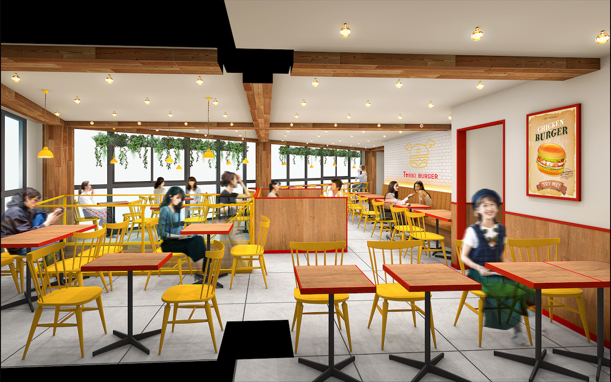 2021年8月23日(月)にオープンする「TORIKI BURGER」。店内は、白色と木を基調にデザインされており、アクセントとしてアイデンティティである黄色を配色することで、楽しくわくわくする空間を演出しています。