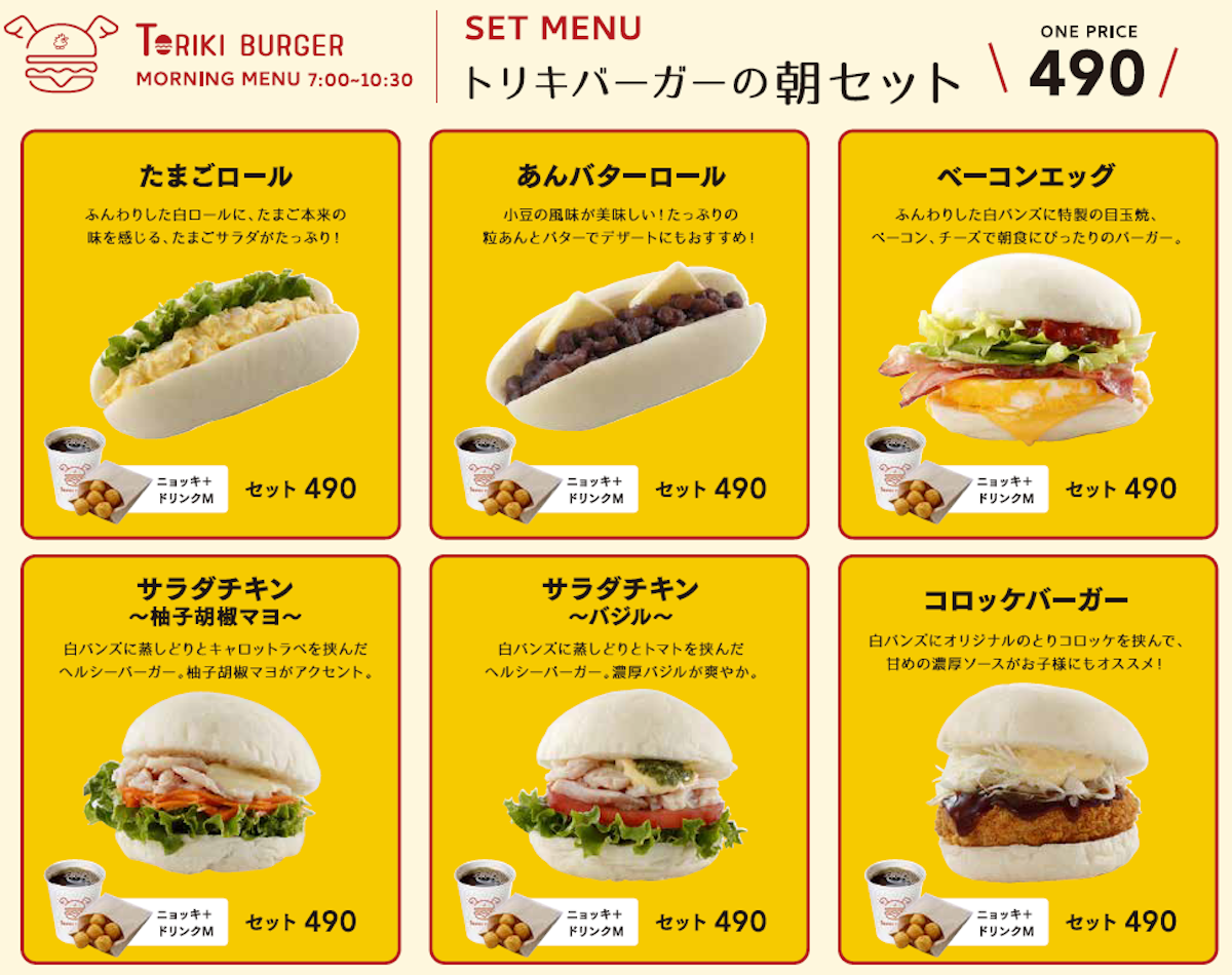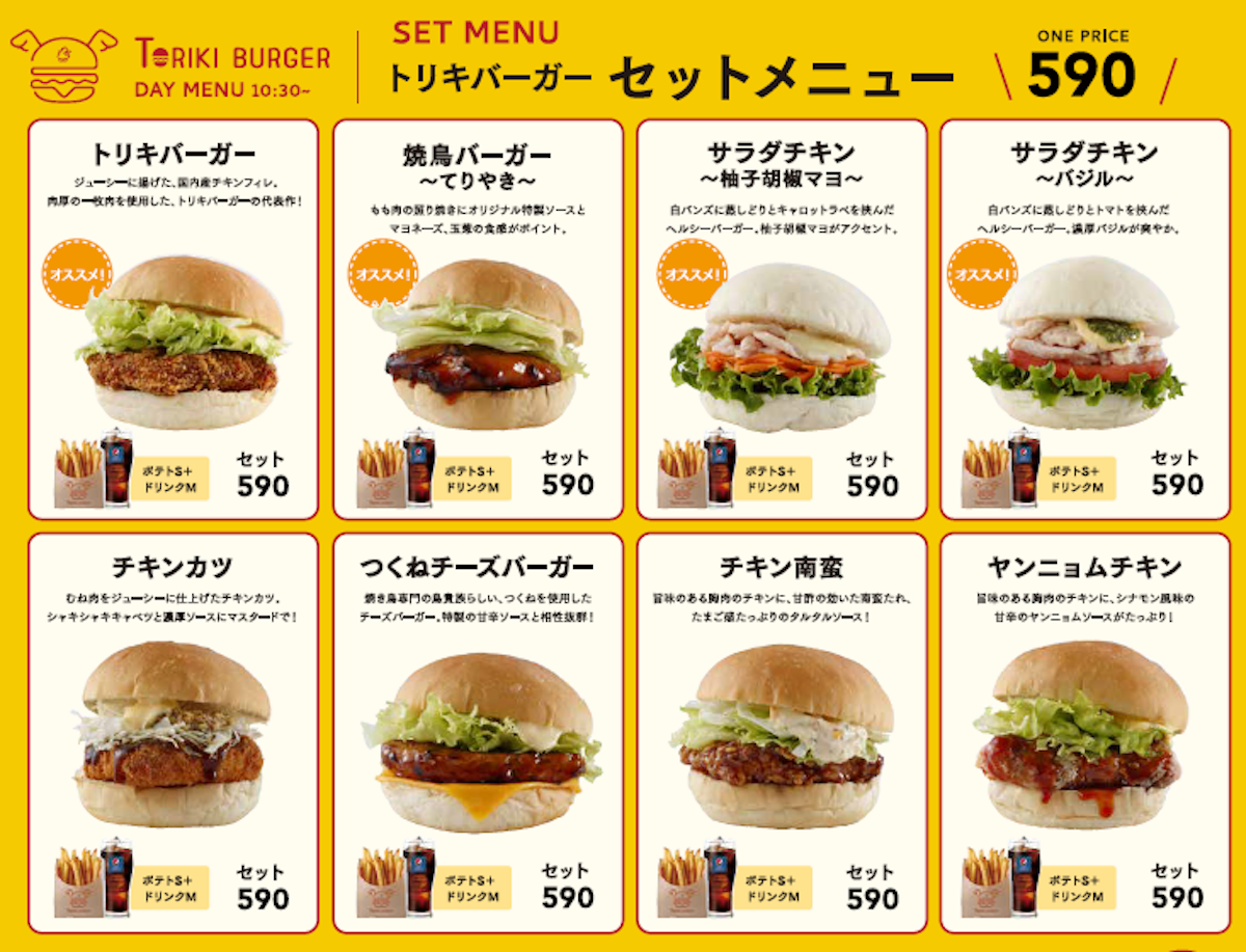 10時30分から提供するデイメニューはこだわりのチキンを使ったバーガー8種類。「つくねチーズバーガー」や「焼鳥バーガー〜てりやき〜」など「鳥貴族」ならではの珍しいメニューが食べられるのも魅力のひとつです。金額はすべて一律で、単品は390円、ポテトSとドリンクMのセットは590円でオーダーができます。