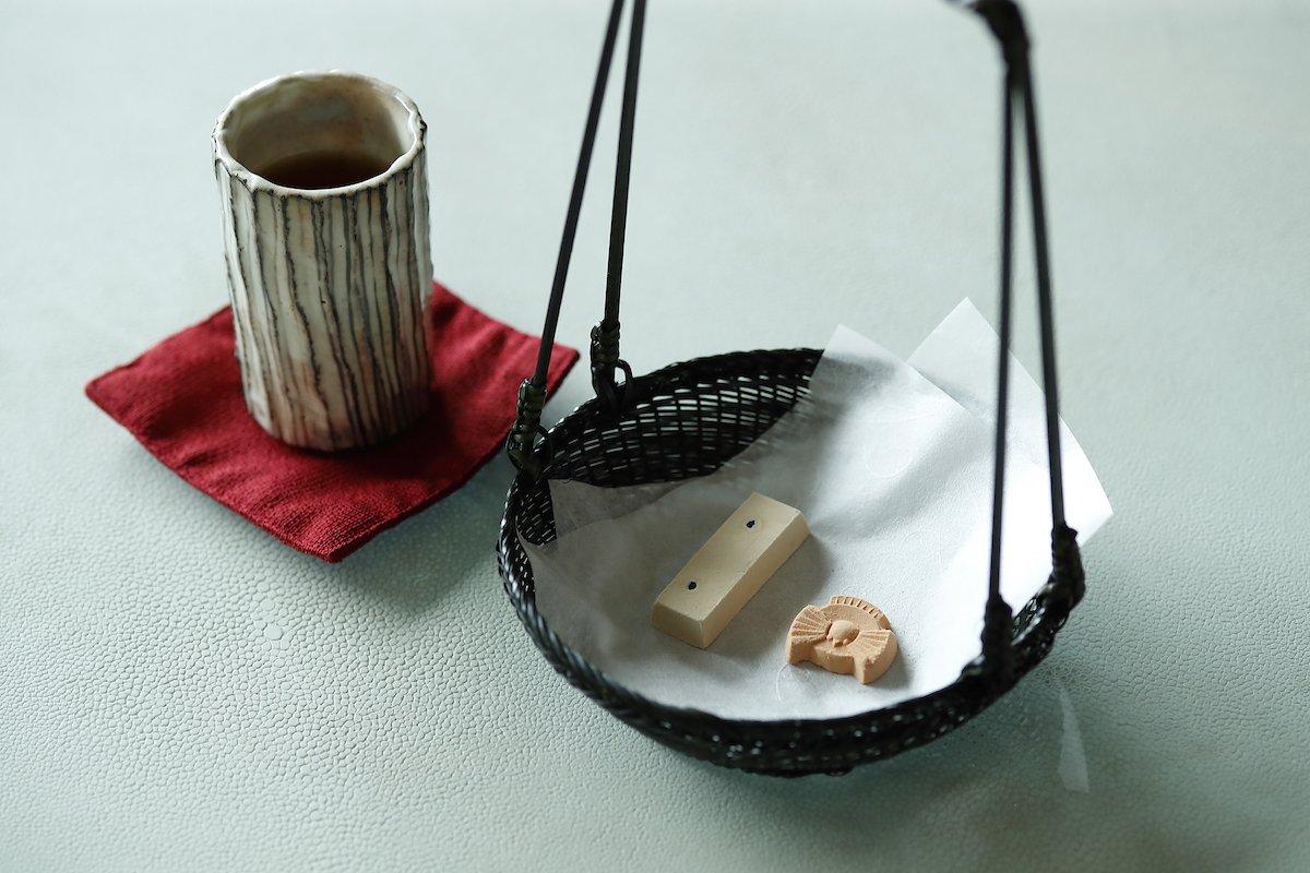 “金沢のおもてなし”をテーマにしたアフタヌーンティーでは、まず「𠮷はし菓子所」による落雁を芳醇な香りの加賀棒茶とともにいただきます。