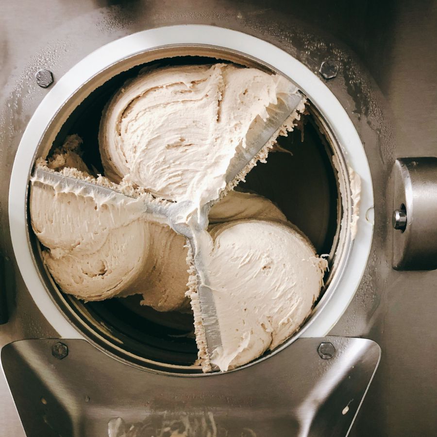 オーガニックココナッツミルクと、オーガニックソイミルクを使用したアイスクリーム。そこに、おからで作ったメープルクッキー、豆乳とお醤油、ラム酒で作ったキャラメルソースを入れてマーブルに♪
