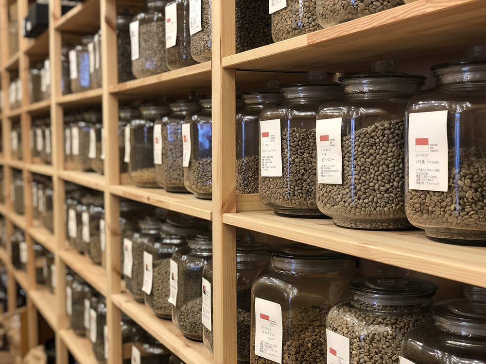 一歩店内に入ると、壁際の棚に整列しているコーヒー生豆の種類の多さに驚きます。