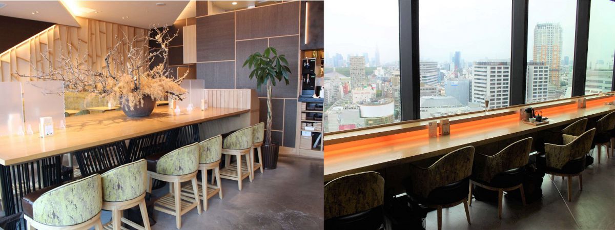 店内は、和の雰囲気を感じる落ち着いた雰囲気。また、窓際の席からは渋谷の街を見下ろすことができます。実際に窓際の席に座ってみると、目の前にスクランブル交差点を見ることができました。なんでも、スクランブル交差点に最も近く、高い場所から見下ろすことができるのがこの場所なのだとか。渋谷の街並みを満喫しながら食事も楽しめるのがうれしいですね。