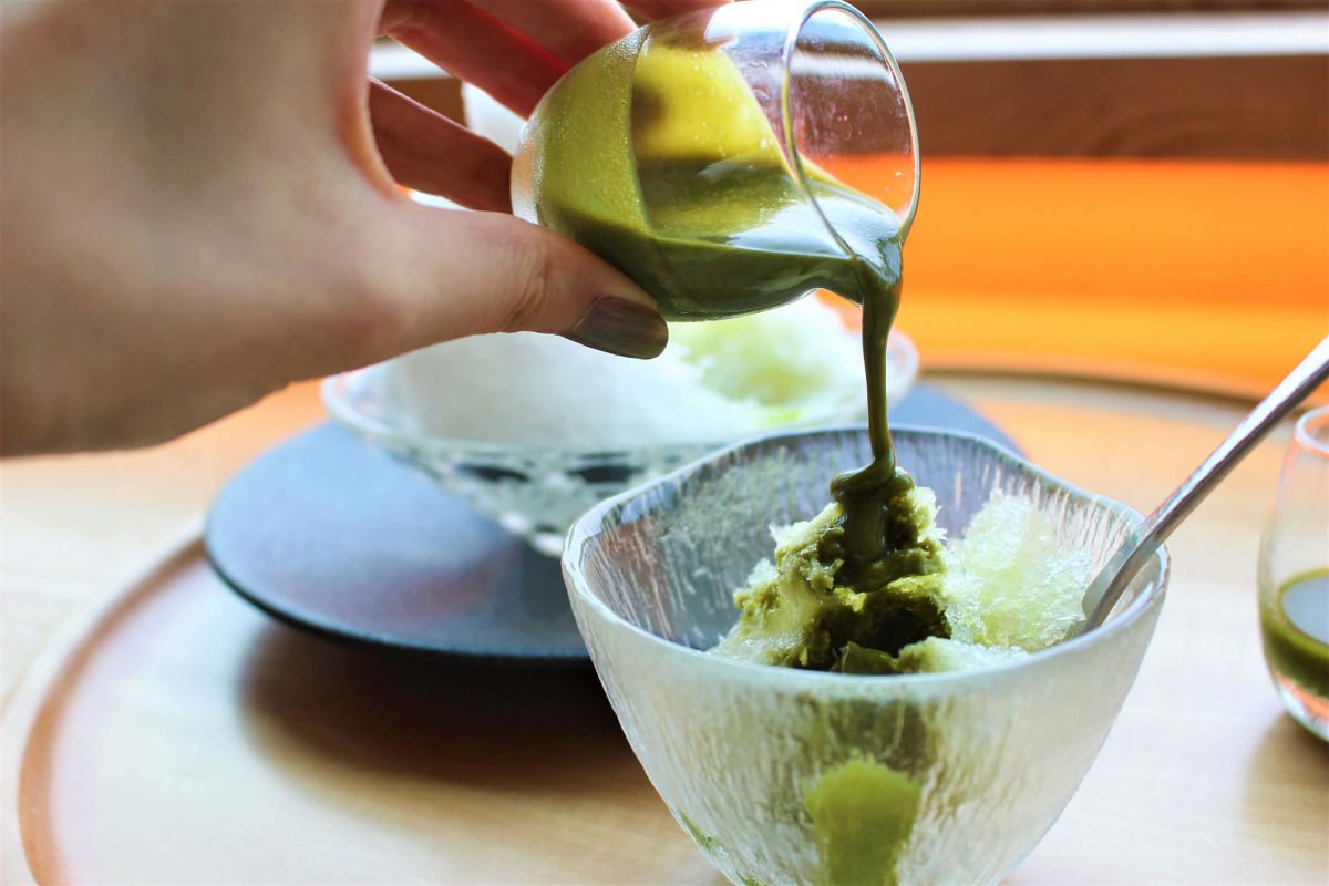 次にいただくのは、私も大好きな抹茶!同じお茶でも、煎茶とはまた違った味に驚きです。ほろ苦く、抹茶ならではの深みを感じます。シロップはもったいぶらず、たっぷりかけて食べることで抹茶の濃厚な味を堪能することができますよ。