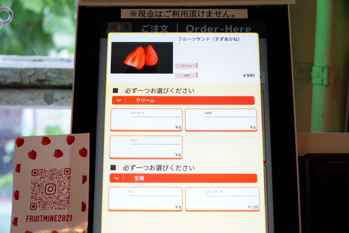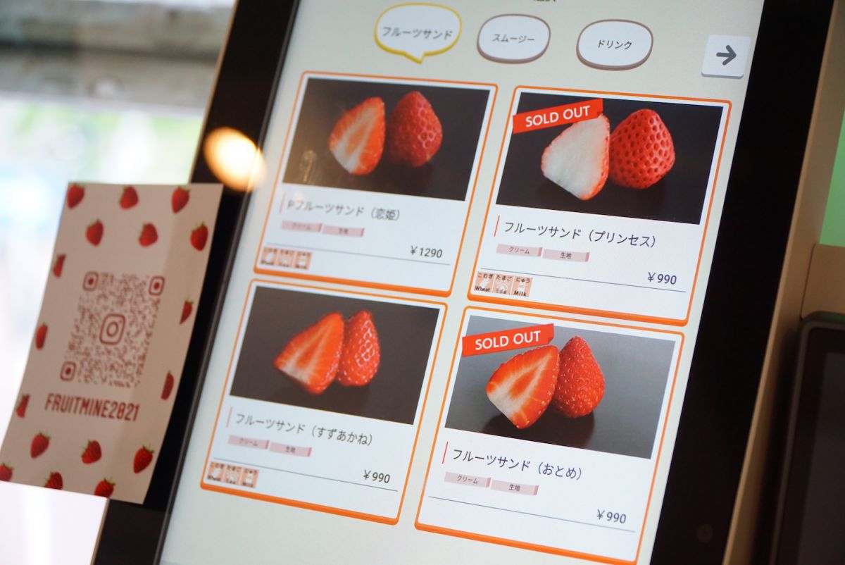 オーダーはタッチパネルから。この日は4種のイチゴがラインアップされており、イチゴの種類によって値段が異なります。支払いは各種カードや電子マネーのみ利用可能で、感染症対策の面でもうれしいですね。現金は利用できないので注意しましょう。