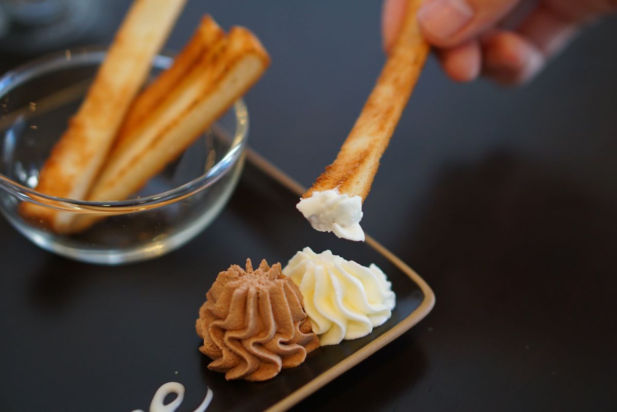 プレートにはパンの耳を使ったラスクと、オーダー時、選ばなかったほかのクリーム2種が付いてきます。違うクリームも試せるのがうれしいですね!これはイートインだけの特権です。