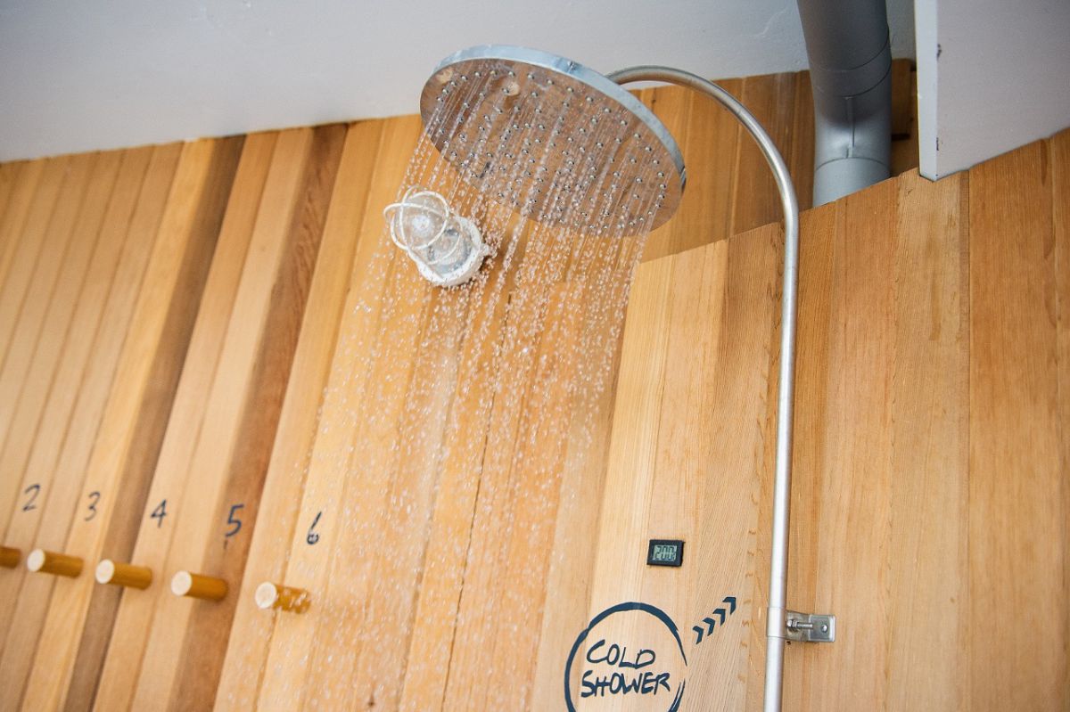 サウナ室のそばにあるチラーシャワー。温水シャワーも併設しています。