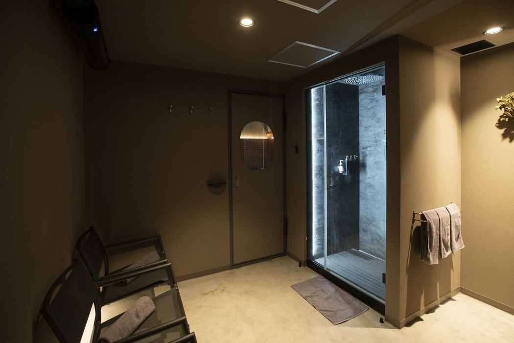 個室に入ると着替えスペース、サウナ、冷水シャワー、ととのいイスが用意され、まさにととのうためだけの空間が広がっています。