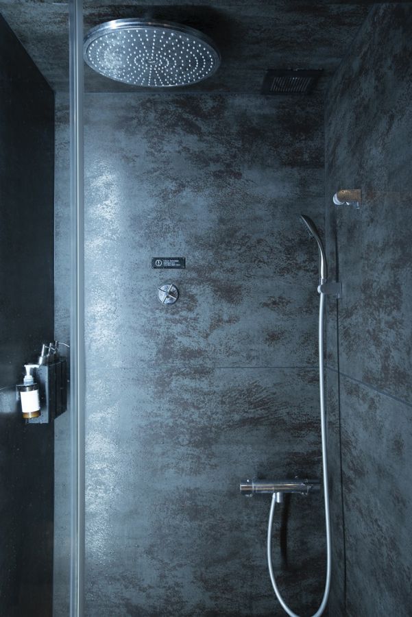 サウナ隣の冷水シャワーでクールダウンできます。つねに15℃の水温に設定されたオーバーヘッドシャワーから流れる大量の冷水が頭から一気に体を冷やしてくれます。水温調節可能なシャワーヘッドも設置されています。