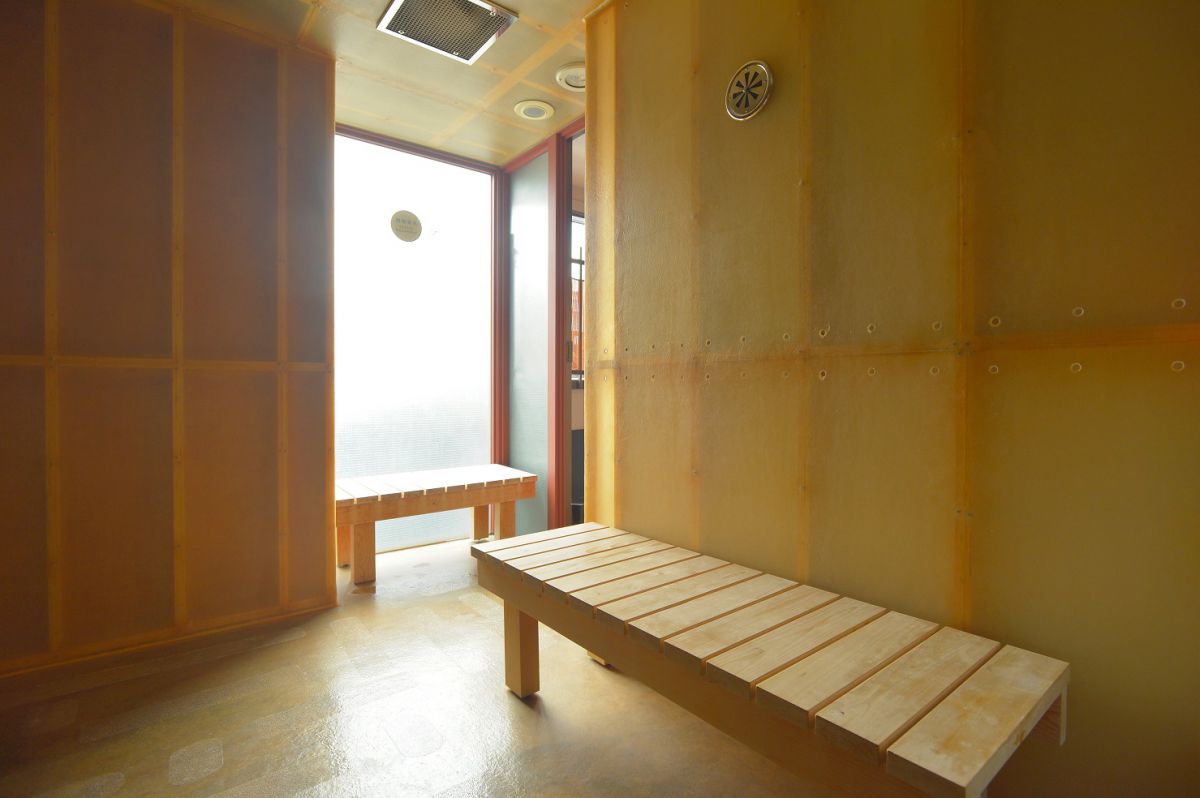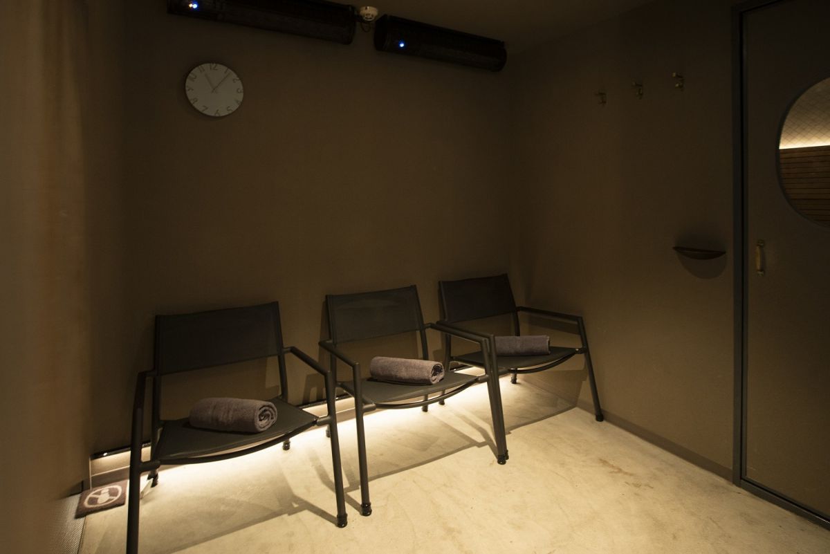 室内にあるととのい用ベンチ。屋外にも外気浴用イスが用意されています。サウナは1時間から利用できるので、すきま時間にサクッと訪れてリフレッシュしたい人にもぴったりです。