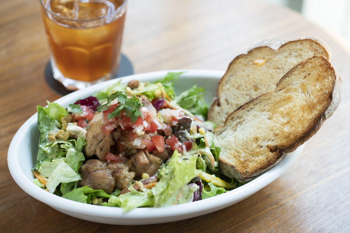 最後は併設のカフェでほっとひととき。ケイジャンチキンサラダ(ドリンク付き)950円。