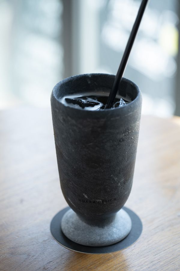 フィンランドの天然石で作られたグラスで提供される「28億年黒酢ソーダ」650円。