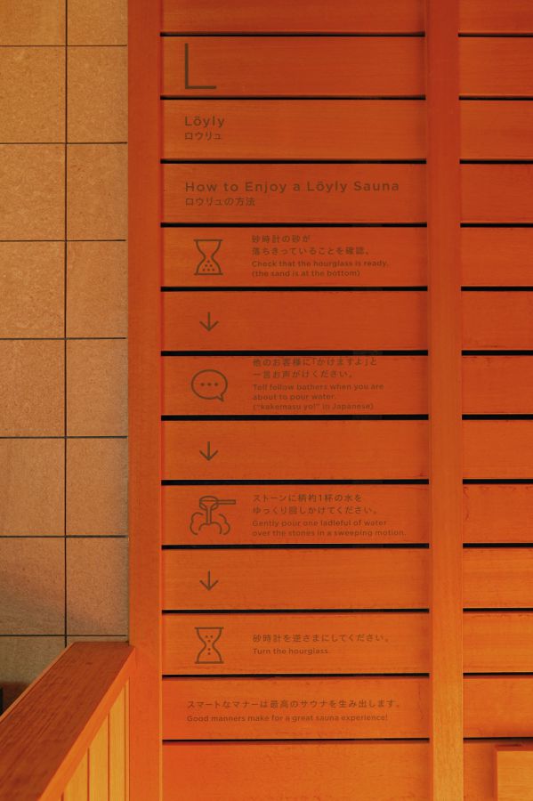 サウナ室ではミント水のセルフロウリュが堪能できます。ベストな状態のサウナを保つため、壁にはロウリュの方法が記載されています。