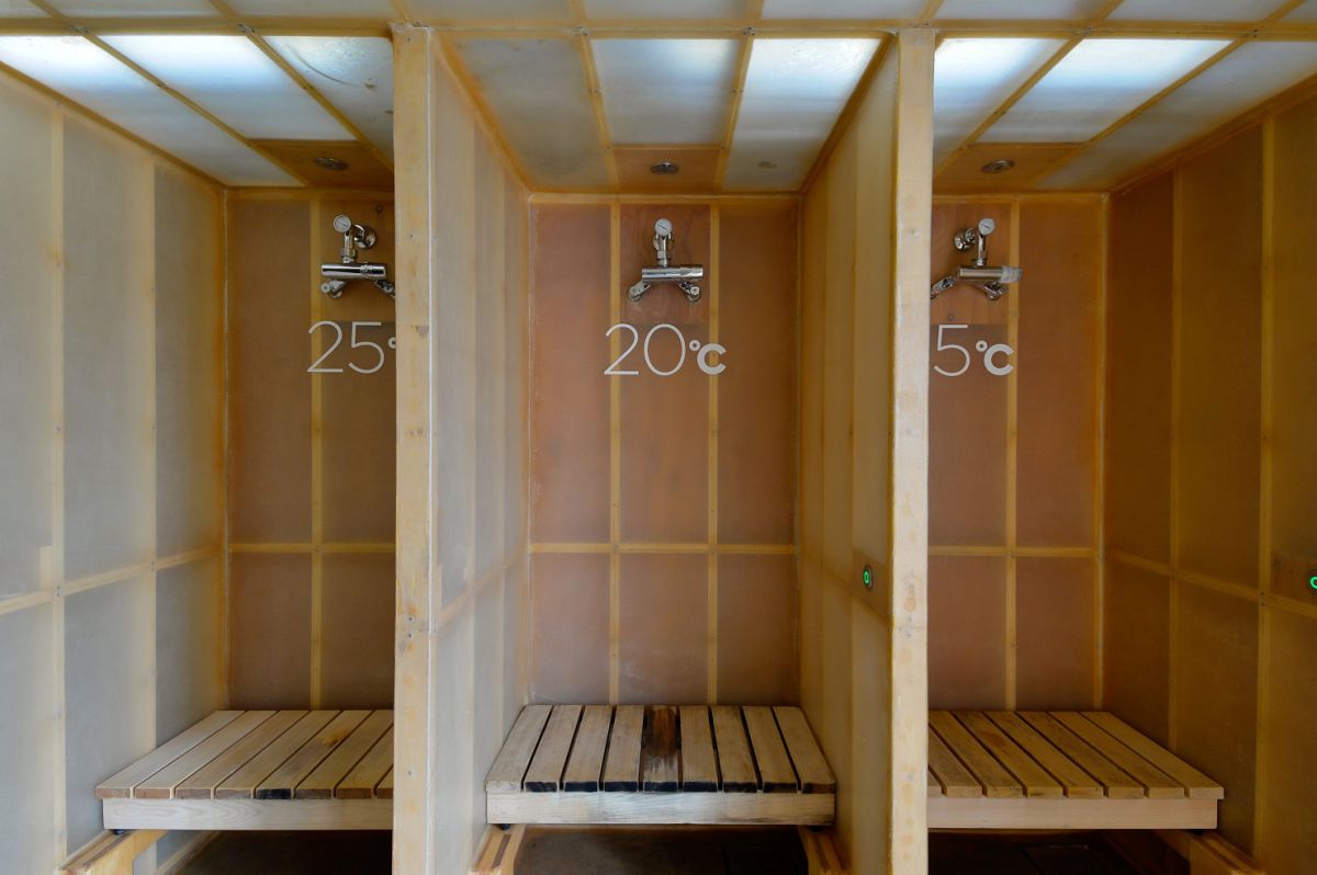 サウナの後は冷水専用のウォームピラーでクールダウン。15℃、20℃、25℃、30℃、常温のなかから好みの温度がセレクトできます。冷水が体に沿うように調節された水流は新感覚の浴び心地です。