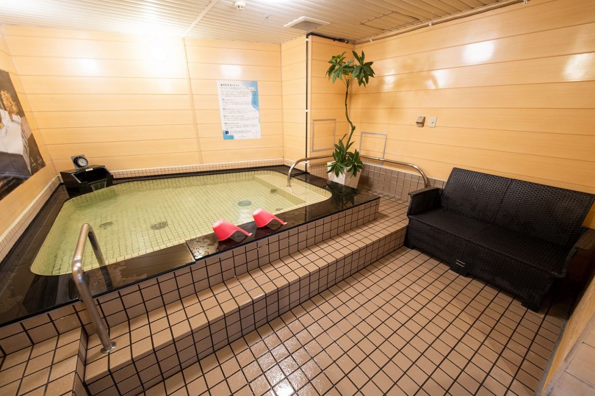 大浴場の浴槽はお湯風呂と水風呂の2種類です。水質を追求し、地下水を利用したなめらかな水風呂はかけ流しで、水位も深く、サウナで疲れた体をゆるやかに再生してくれます。