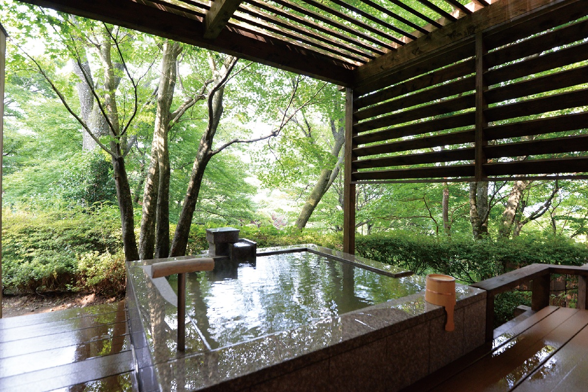 『箱根強羅 白檀』は周辺の自然をふんだんに取り込み、宿名の通り、館内に漂うほのかな白檀の香りが特徴の宿です。全室露天風呂付の客室は和の空間で、箱根連山や自然園の眺望を楽しめ、森林浴と温泉を一緒に満喫できます。