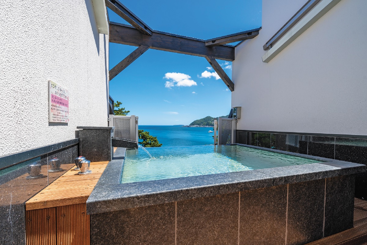 『食べるお宿 浜の湯』は視界を遮るものが何もない岬の最先端に立っています。館内のどこにいても海を眺められるのは、この立地ならでは。テラスに開放的な露天風呂を備えた部屋では上質なプライベートと圧巻の景色を堪能できそうです。