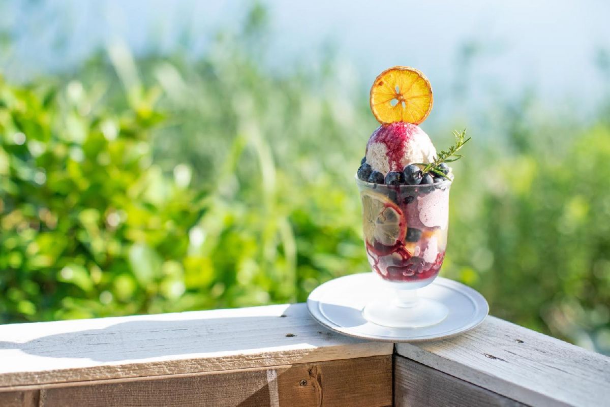 ブルーベリーがたっぷり入ったブルーベリーのパフェ 1320円。豆乳で作るアイスも美味!