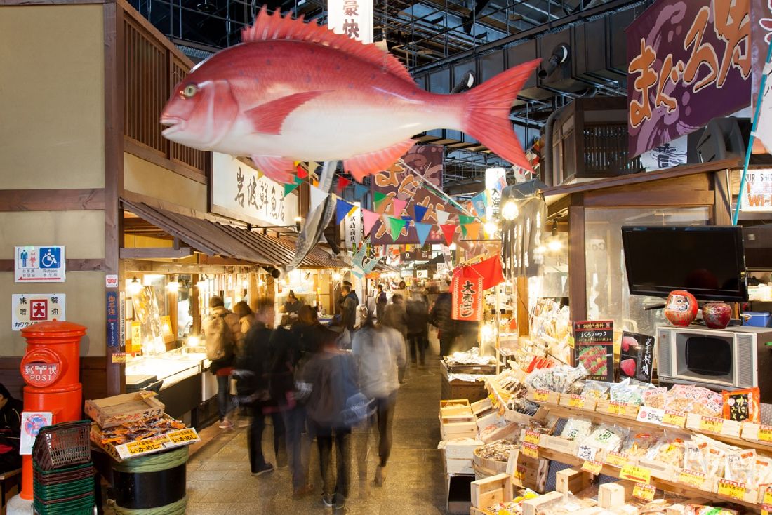 和歌山マリーナシティ内にある黒潮市場は、マグロをはじめとする海鮮や梅干し、醤油などの特産品が大充実で、おみやげ探しにぴったり!フードコートやレストラン、バーベキューが楽しめるコーナーもあり、グルメスポットとしても大人気です。マグロの解体ショー(毎日12時30分~)に参加するならお昼頃までに訪れて!