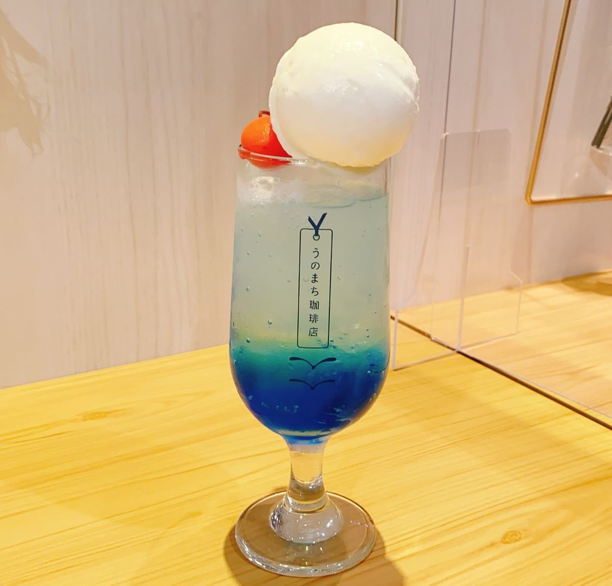 こちらもまず、そのかわいさに目が奪われてしまいます!グラスのふちに乗ったまん丸のバニラアイス、グラスの中で美しいグラデーションを見せるソーダ。グラスのロゴのカモメとあいまって、海辺の風景を連想させます。
