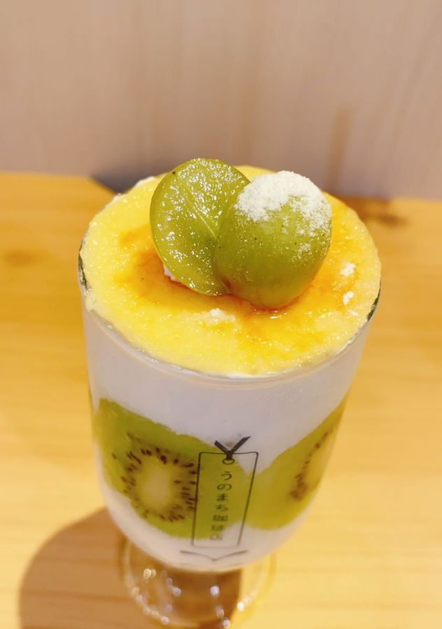 まずご紹介するのは、「クレームブリュレの季節のパフェ」1000円(別途ドリンクのオーダーが必要)。今回はキウイフルーツのパフェでした。商品が目の前に現れた瞬間、あまりのかわいさに胸を撃ち抜かれるよう。キュンキュンしてしまいます!