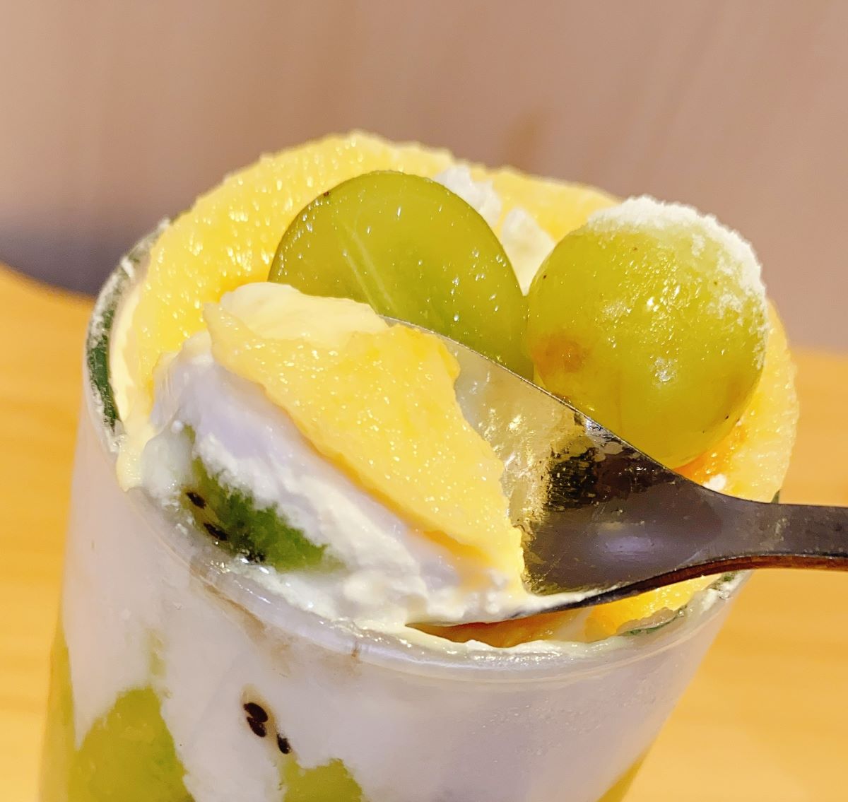 でももっと驚いたのはこのかわいいパフェの中を食べてから!パフェの一番上を飾るのは、マスカット。その下はクレームブリュレがふたのようになっており、割るとカスタードクリームの層がでてきます。こちらはなめらかで甘みがしっかりと感じられます。