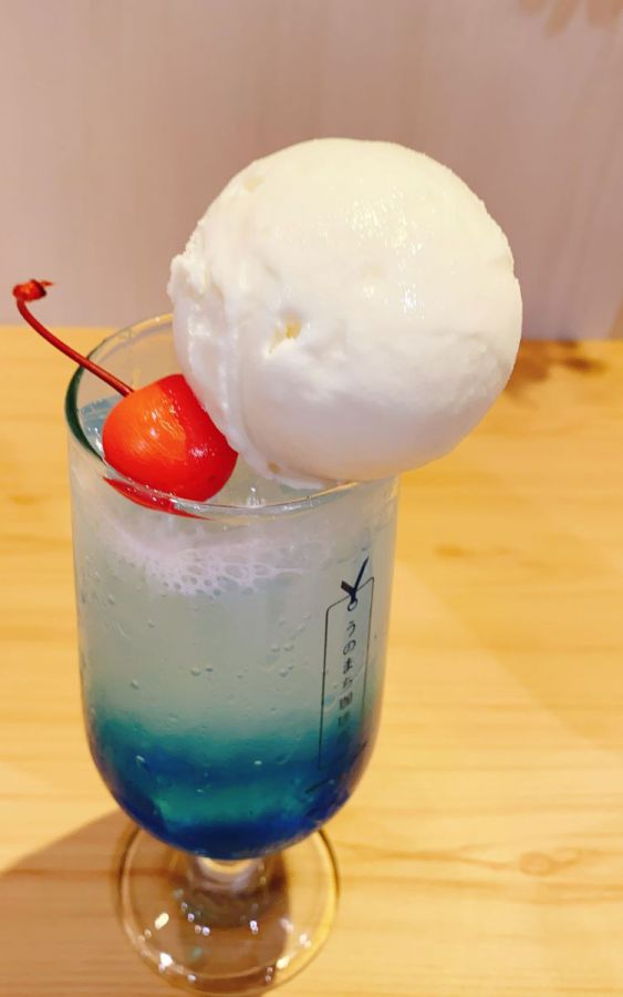 次にご紹介するのは「うのまちクリームソーダ」700円。3種類から選べるようになっており、今回頼んだのは柑橘風味で甘めの「あお」。ほかにはキウイフルーツ味の「みどり」、柑橘風味で甘さすっきりの「あか」もあります。