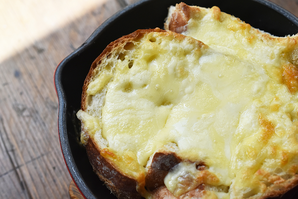 チーズをたっぷり乗せて焼き上げたパンと合わせると、チーズのコクがプラスされてより食欲が進みます!見た目以上にボリューミーなので、スープはお腹の具合に合わせてスモールサイズも選べます。