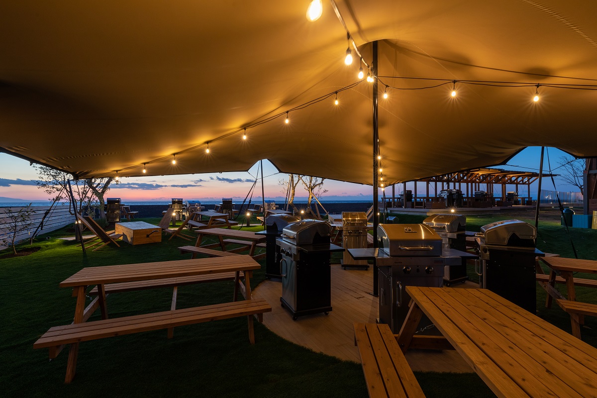 空が暗くなり始めると、ガーデン内のところどころをライトアップ。タープの中に明かりがともされると、昼間とは全く違う落ち着いた大人の空間に早変わり。