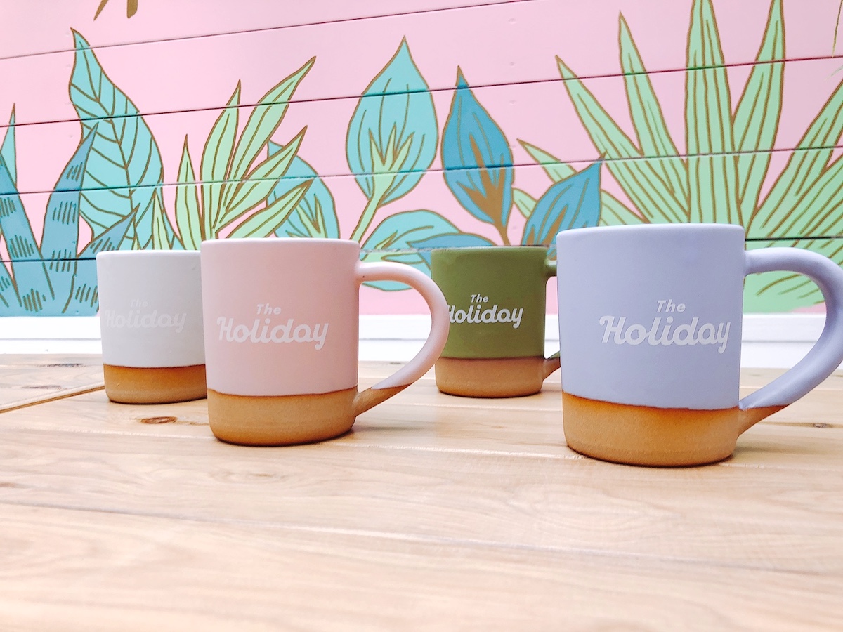 「The Holiday(LOUNGE)」では暮らしのなかで役に立つグッズも販売中。おうちに帰ってからもくつろぎのひとときを思い出させる洗練されたアイテムが揃います。「HOLIDAY MUG」各1650円は、岐阜県美濃焼の「作山窯」とコラボしたオリジナルグッズ。国産の土を使い、ひとつひとつの工程を職人の手で施しています。日本人ならではの繊細さを感じることができる手触りやフォルムが特徴。独特なカラーがかわいらしいカップはインテリアにもなりそう。