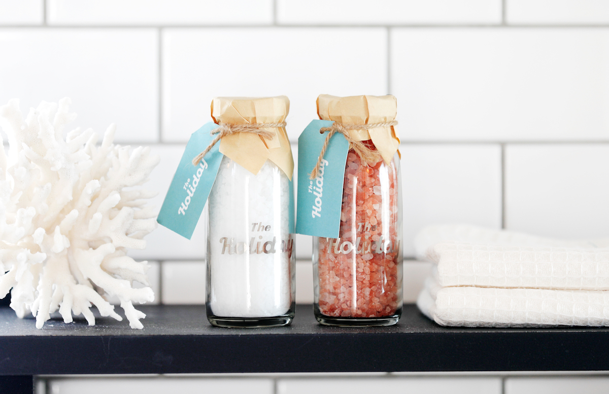 旅気分を一層盛り上げてくれるのが、オリジナルのバスソルト「HOLIDAY BATH SALT」1650円。ホワイトソルトはイスラエル産、ピンクソルトはヒマラヤ産で、多数のスパやマッサージでも使われる品質のよいものをセレクトしています。牛乳瓶をイメージしたパッケージにトラベルタグをイメージしたタグもキュート。使い終わった後も花瓶などに活用できますよ。プレゼントにもおすすめです。