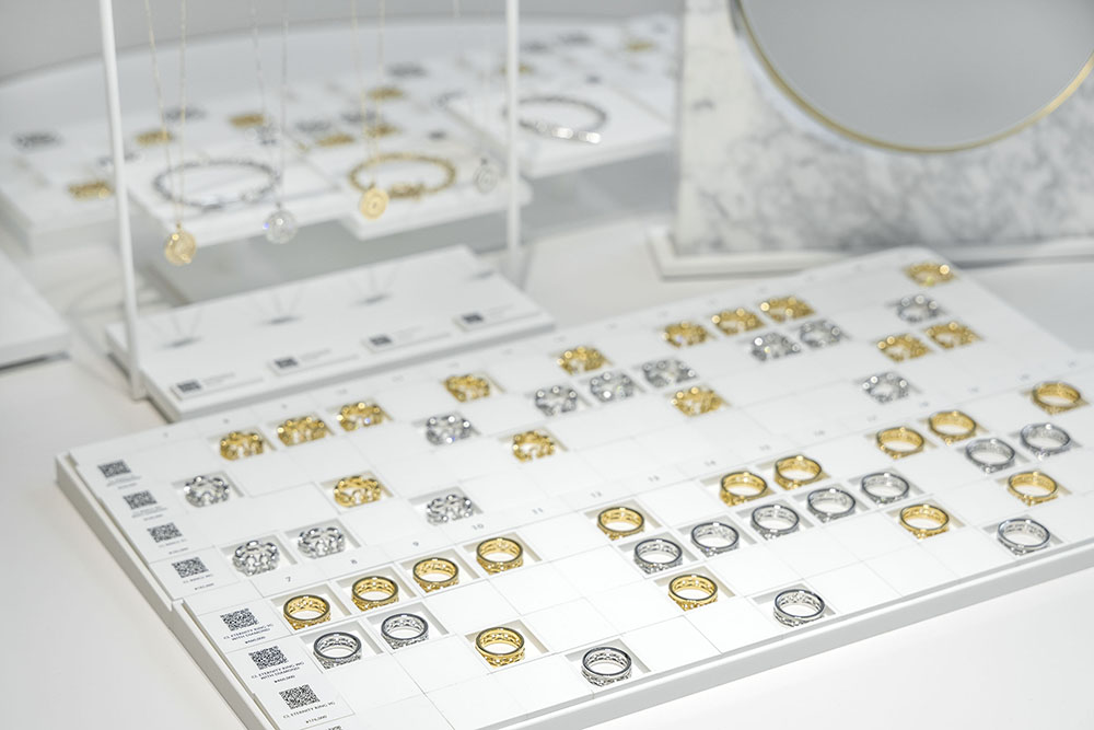 店内にはフラットにジュエリーが飾られており、自由にジュエリーの試着をしてOK!来店時にリングメジャーをプレゼントしてくれるので、ぴったりサイズのジュエリーが選べちゃいます。