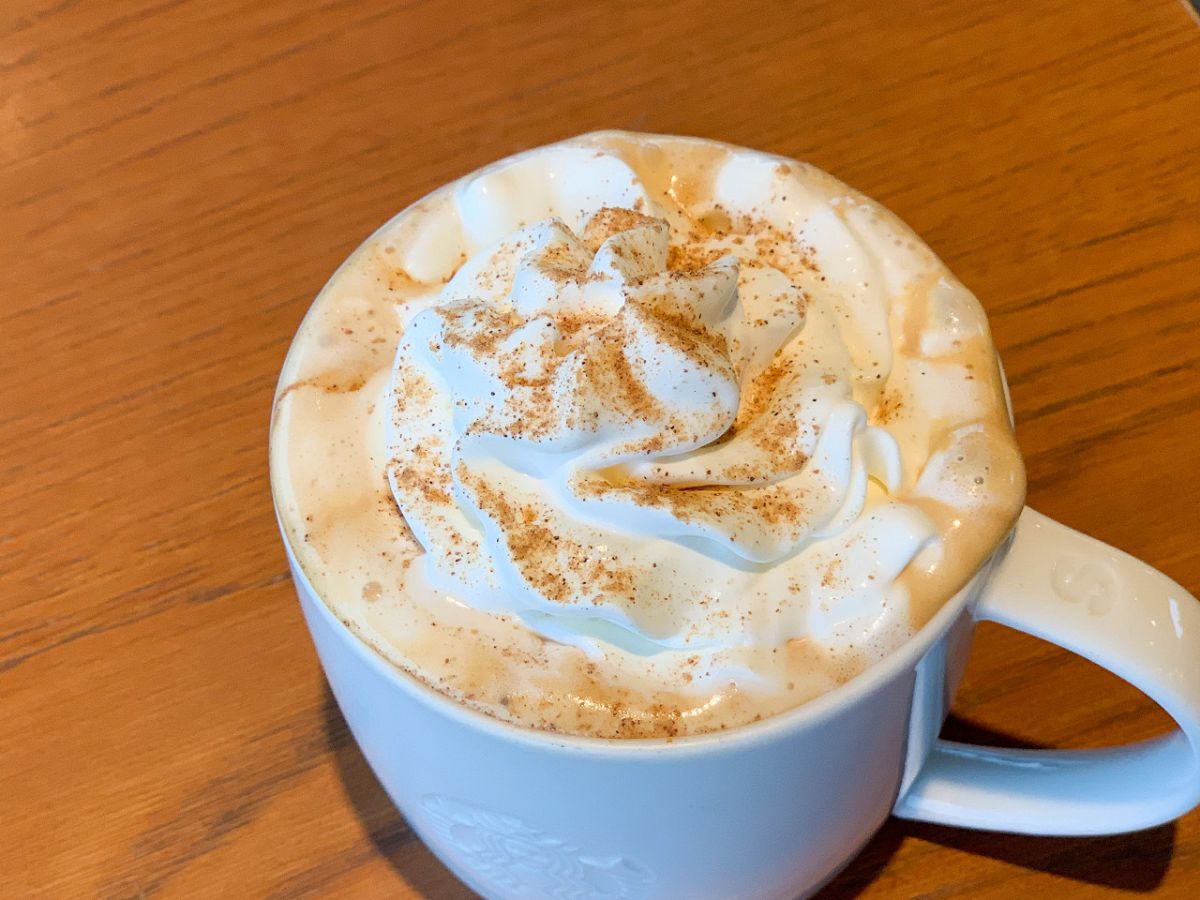 パンプキン スパイスとは、秋の定番スイーツ・パンプキンパイの味の決め手となるシナモン、ジンジャー、ナツメグ、クローブなどのスパイスのこと。スターバックスの「パンプキン スパイス ラテ」は、かぼちゃのピューレに、パンプキン スパイスのフレーバーを加えたソースと、いれたてのエスプレッソ、スチームミルクが混ざり合うビバレッジです。ホットとアイスがありますが、今回はホットを飲んでみました。