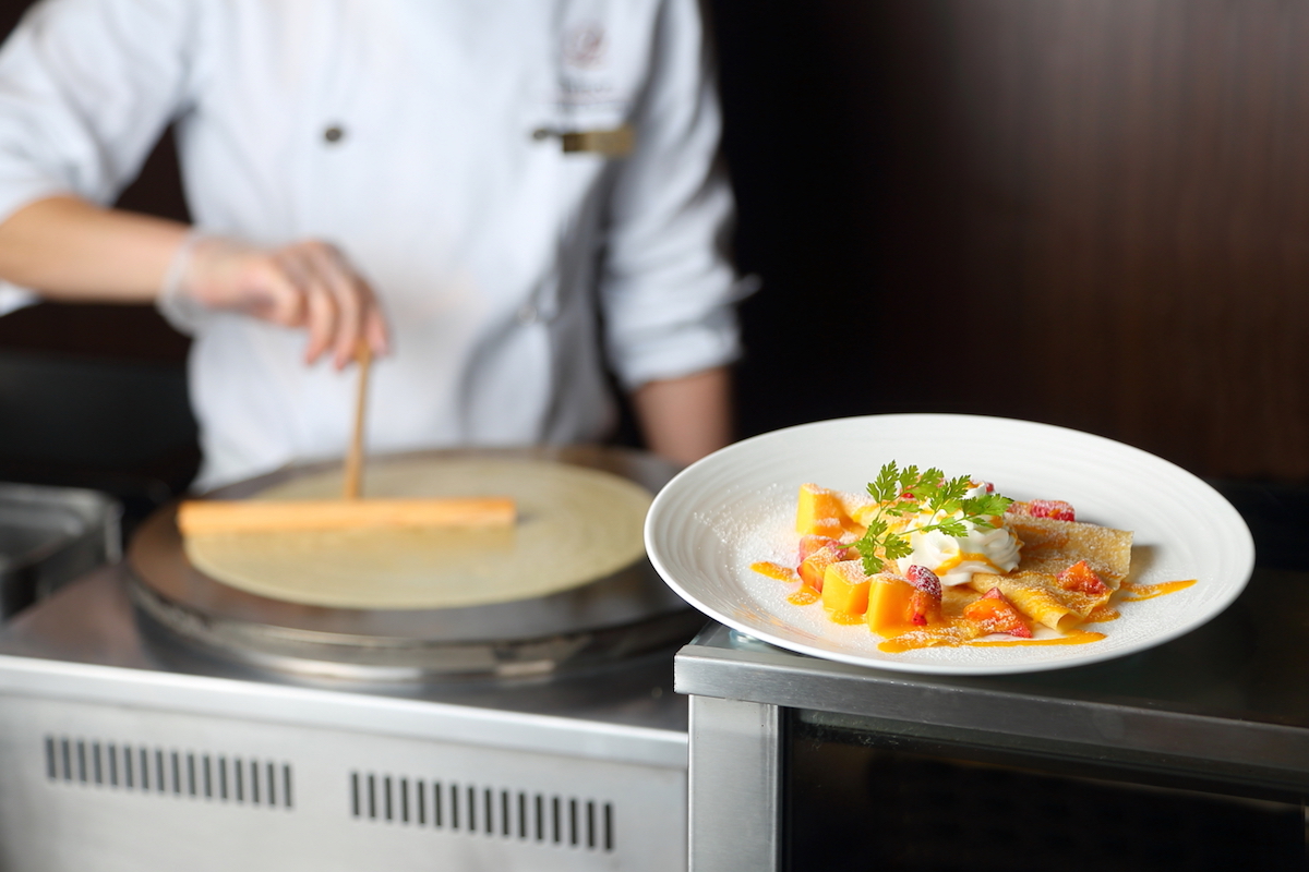 さらにクレープも焼きたてがいただけちゃいます。イチゴとマンゴー、生クリームをトッピング。甘酸っぱいマンゴーソースと一緒にいただきます。