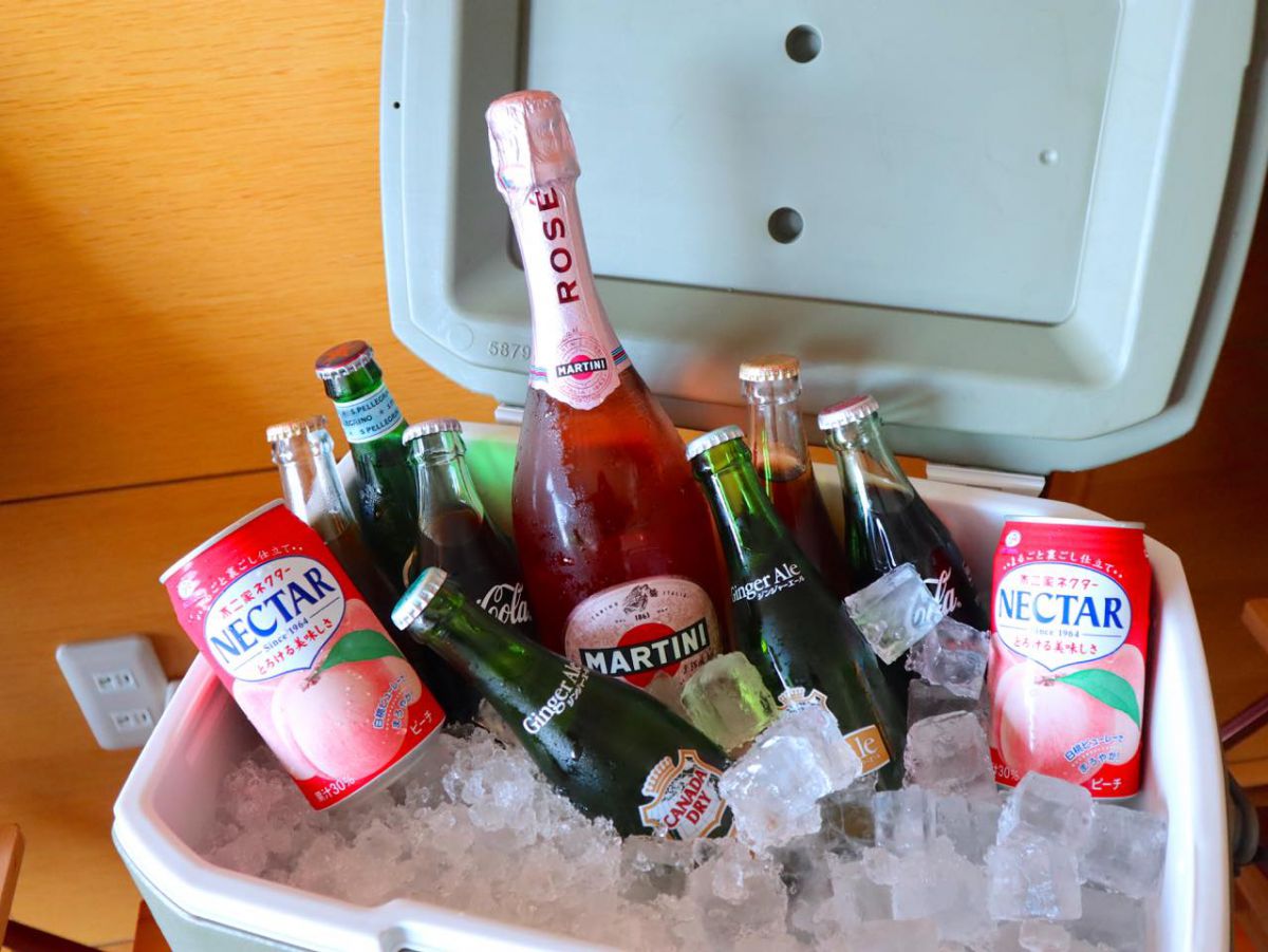 ・ドリンク 6 種(スパークリングワイン 1 種、ソフトドリンク 5 種)をコールマンのクーラーボックスに入れてルームサービス