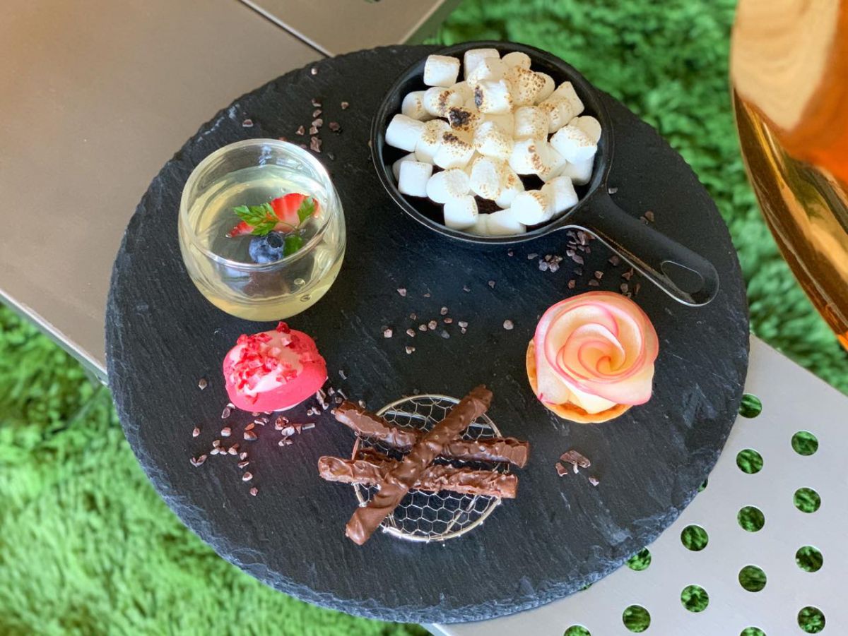 やはり追加料金なしのルームサービスで提供されるデザートは、キャンプをテーマにしたオリジナルデザートがワンプレートに。ミニスキレットには焼きマシュマロ、花びら型のりんごのデザート、チョコレートオランジェ、ライチゼリーなど華やかなラインナップがそろいます。(デザートの種類は時期によって変わる場合もあります)