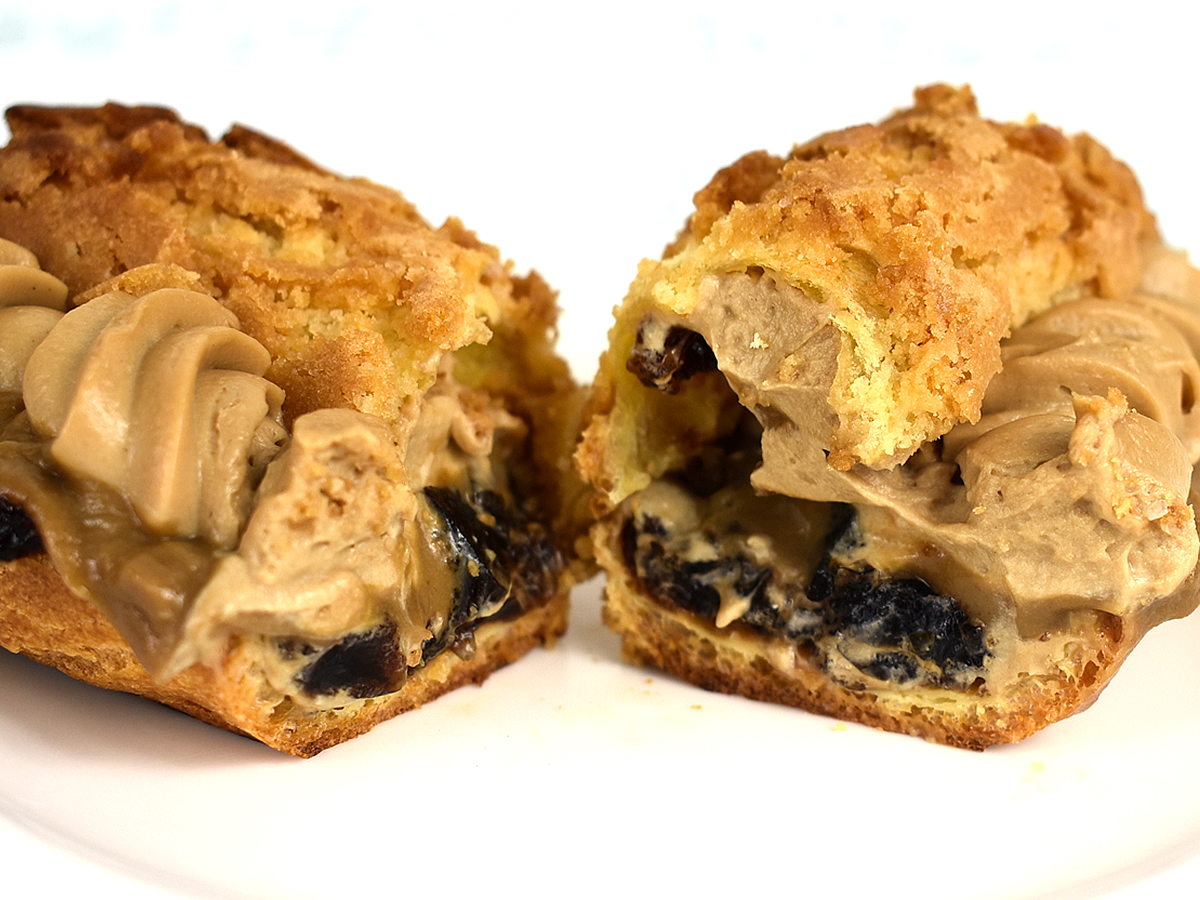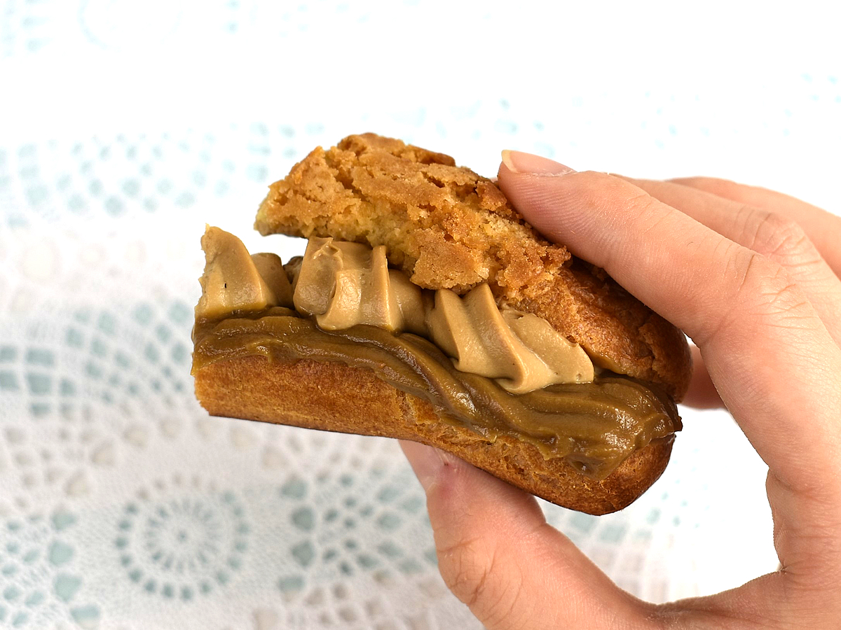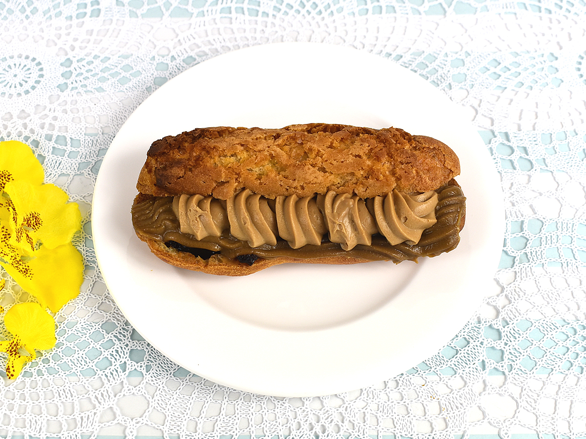 味を引き締める決め手はクリームの下に敷かれたコーヒーゼリーです。甘みをほとんど感じない、目が覚めるような苦味にびっくり。クリームのほのかな甘さを引き出し、素晴らしいコンビネーションを見せています。また忘れてはいけないのが香ばしく焼き上げられたエクレア生地。噛むたびにバターの風味をふんだんに楽しめる上質な生地で、全体の一体感も抜群でした。
