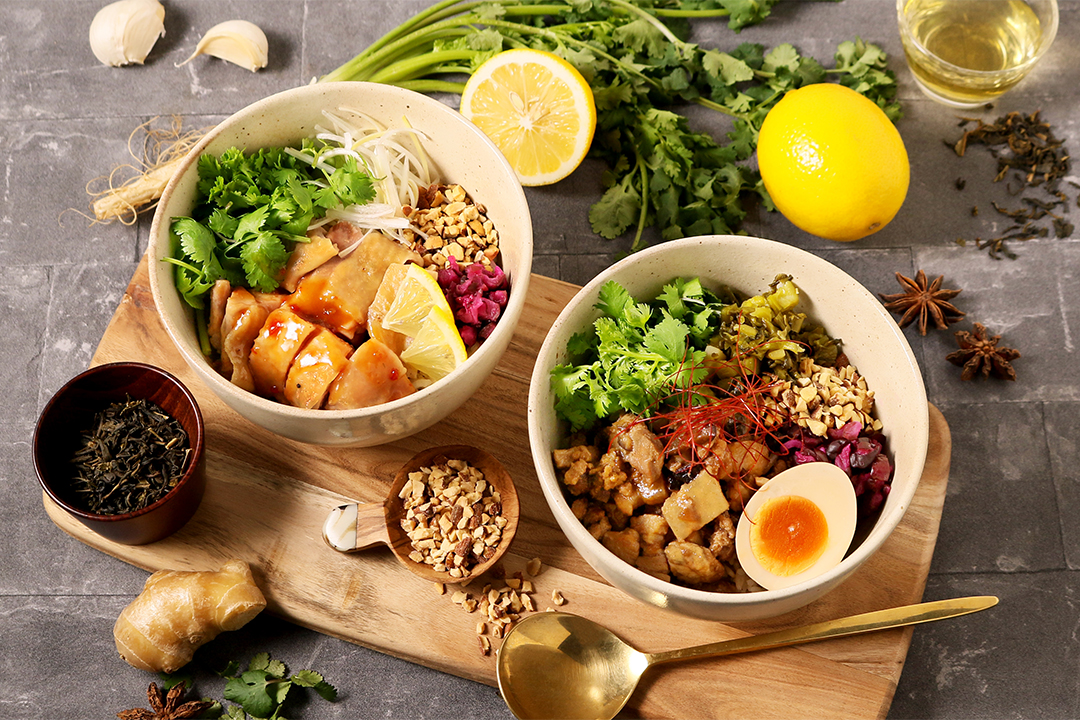 「THE ALLEY」は茶葉を使ったフードメニューも充実。「豚肉の甘辛煮と煮卵の茶飯」(770円)や、「やわらか茹で鶏と自家製味噌だれの茶飯」(770円)のごはん系や、ヘルシー系の「貝柱、トマトのティースープ春雨」(693円)や「海老と彩り野菜の豆乳ティースープ春雨」(748円)、カラダに優しそうな「鶏肉と白髪ねぎの生姜香る茶粥」(660円)など、ランチにもぴったり。