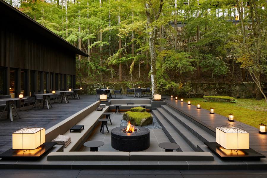 鷹峯三山の麓に佇む「アマン京都」内のダイニング。こちらでは、京都近郊の食材を使ったメニューがいただけます。重箱仕立てのアフタヌーンティーは、四季折々の趣が楽しめます。心地よい風を感じられるテラス席では、美しい庭や鷹峯の自然が一望できます。