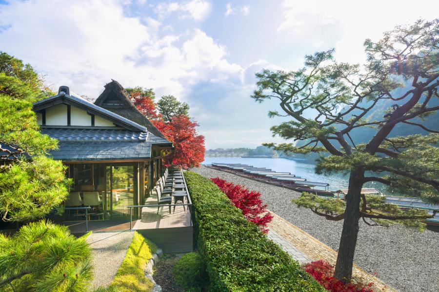 次にご紹介するのは、海外ホテルブランドが手掛ける「翠嵐 ラグジュアリーコレクションホテル 京都」内のカフェ。地元の老舗和菓子店とコラボした和のアフタヌーンティーは、季節ごとのお楽しみです。渡月橋の上流にある茶寮のテラス席や窓際席からは、保津川や嵐山の紅葉が望めます。