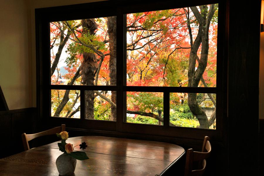 続いては、元東伏見宮家の別邸を利用した料理旅館。建物は国の登録有形文化財という貴重なもので、敷地内にティーサロンを併設しています。自然に囲まれた窓からは、比叡山や大文字山も見えます。また、三方が窓になった2階席は温かみのある空間。まるで紅葉に囲まれているような気分になれます。