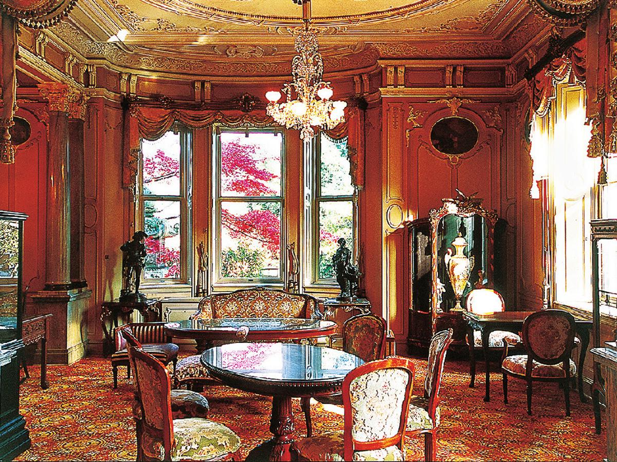 こちらは、京都の実業家・村上吉兵衛が、明治42年(1909)に建てた迎賓館。ルネサンス風の外観にアンティーク家具などが残されたクラシカルな空間で、紅茶やスイーツを提供しています。写真の「迎賓の間」は、アフタヌーンティー専用のお部屋。ロココ調の空間の向こうに、鮮やかな紅葉が広がります。