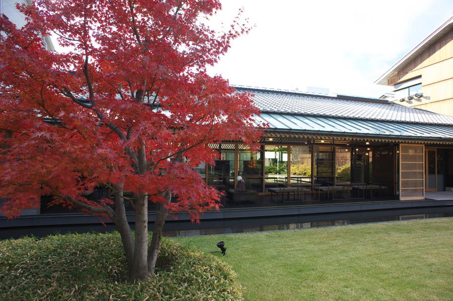 最後にご紹介するのは、室町時代後期創業の和菓子の老舗が手掛ける喫茶。和三盆糖の蜜でいただく葛切をはじめ、銘菓のようかんや季節の生菓子を堪能できます。美しく手入れされたお庭も見事です。開放感あふれるテラス席は、すぐそばの水盤に映る紅葉もすてきです。